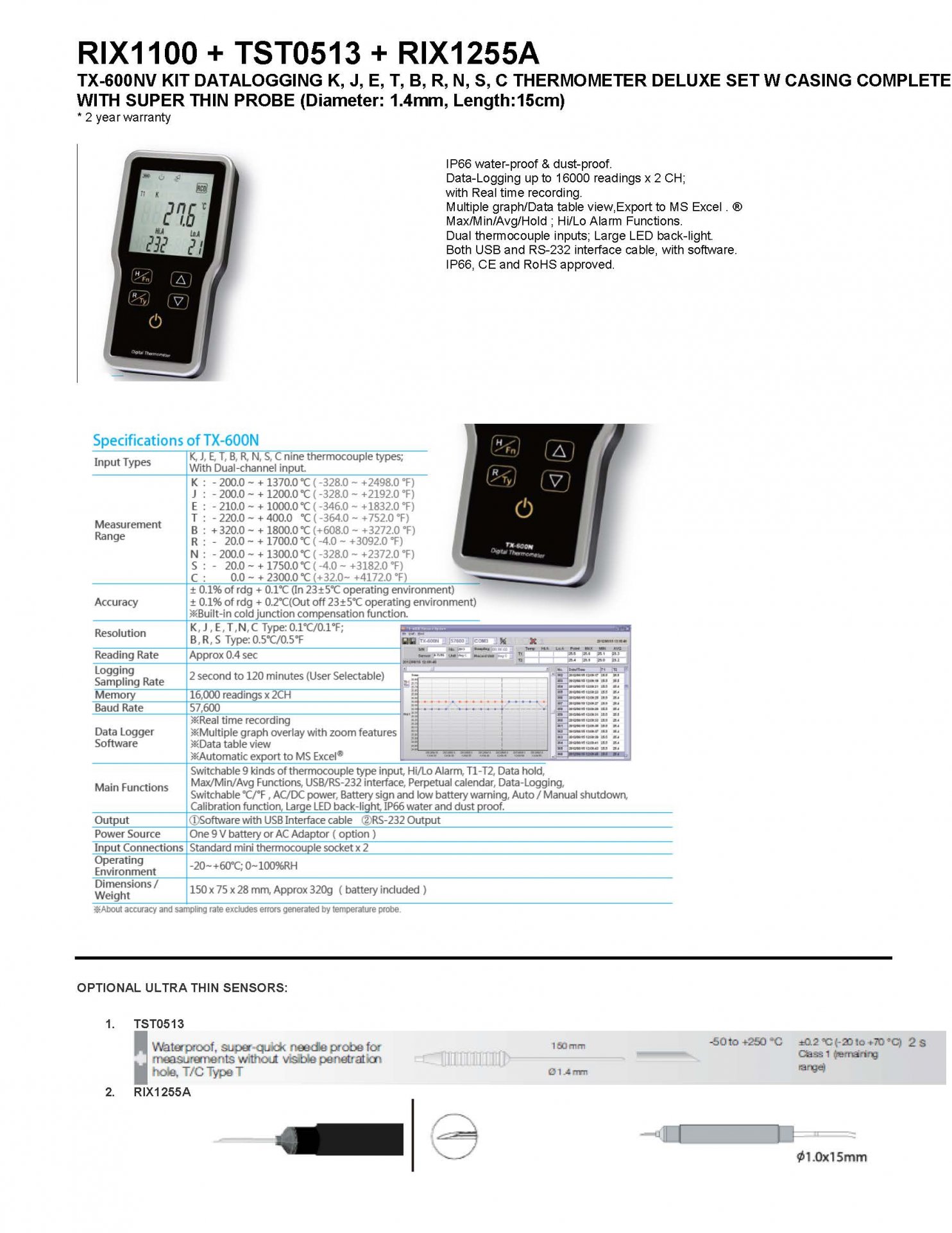 RIX1100-TX-600N DATALOGGING THERMOMETER DELUXE SET FOR K, J, E, T, B, R, N, S, C